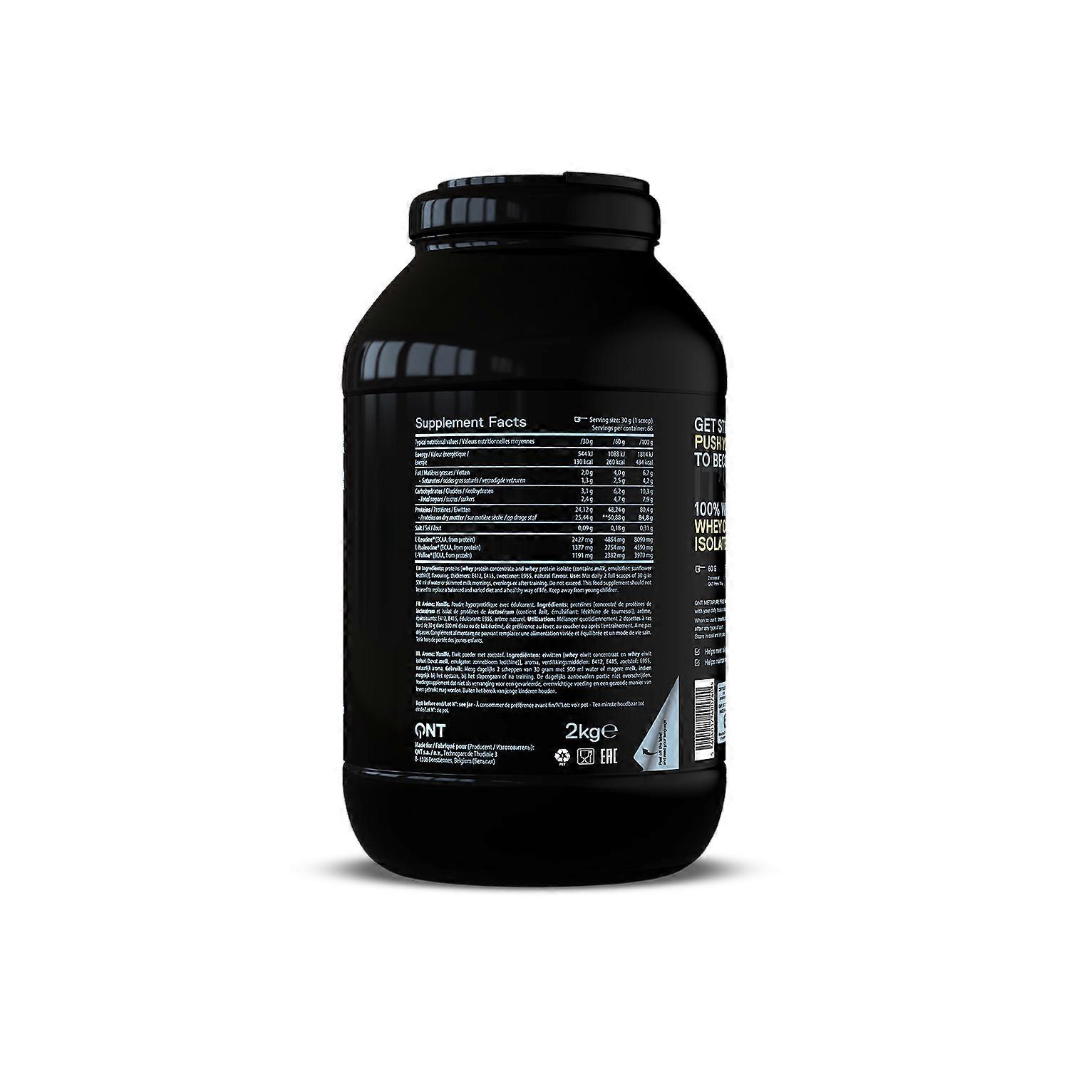 QNT Prime Whey Protein Powder 100% Whey Isolate Helps increase muscle size and strength Contains whey isolate Rich in BCAA’s (L-Leucine, L-Valine and L-Isoleucine) Zero sugar added Naturally rich in branched chain amino acid (BCAA), Prime Whey contributes to muscle growth and maintenance of body tone. This new range is ideal for all strength sports and can be used in a rapid fat loss program. Prime Whey is also 100% Whey Protein with a high concentration of Whey Isolate. This high quality protein powder with a complex formula will accompany you in your goals to help you surpass yourself and explode your goals. In addition, the flavours have been completely reinvented to offer you even more flavour Available in 8 particularly delicious flavours, you will be won over by an intense taste and a texture that binds perfectly with water or milk. Very easy to digest and assimilate, you will also be surprised to have finished your whole shaker and already thinking of the next one. Prime Whey will also surprise you with its extremely soluble texture, making it easy to mix and enjoy without lumps. Rediscover the pleasure of consuming protein What are the benefits of Prime Whey ? Whey protein extracted from cow's milk, is highly prized in the world of sports and especially in the world of bodybuilding for its many beneficial properties. Enriched with BCAAs, Prime Whey will help to act both on muscle mass gain, but also on muscle recovery after your most intense workouts. This new range can also be used in the context of weight loss to replace higher calorie foods while nourishing healthily and efficiently your muscles. Prime Whey is a high quality protein powder with a complex formula that is suitable for both beginners and experienced athletes seeking performance. Prime Whey helps build lean muscle mass Protein is the essential element for muscle tone, growth and recovery. The amount of protein available in the body will directly affect how muscle mass will develop. The high quality whey protein in Prime Whey contains all the essential amino acids and is absorbed very quickly by the intestine. In particular, this will allow you to make the best use of the metabolic window that opens after a workout session. Thanks to these qualities, the whey protein is one of the best supplements available to help stimulate muscle growth. It is by synthesizing the protein available in the body that muscle fibers will grow and strengthen. With a high concentration of whey protein and very little sugar and carbohydrate, Prime Whey acts directly on the muscles to help them grow significantly. As part of a healthy and sporty lifestyle, its beneficial effects on muscle mass are increased tenfold. With its complex formula rich in protein and amino acids, Prime Whey also proves to be a valuable component in weight loss programs.