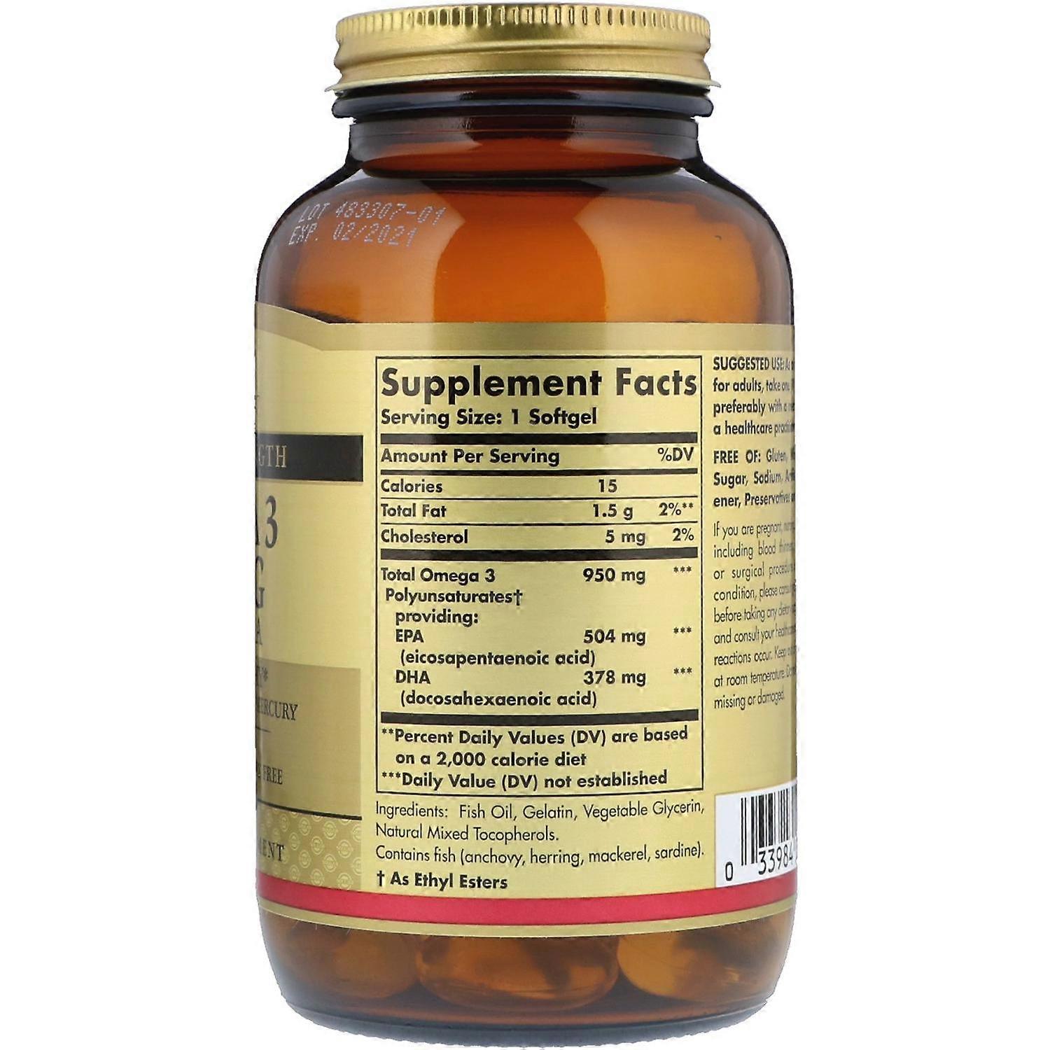 Suggested Use As a dietary supplement for adults, take one (1) softgel twice daily, preferably with a meal or as directed by a healthcare practitioner. Other Ingredients Fish oil, gelatin, vegetable glycerin, natural mixed tocopherols. Contains fish (anchovy, herring, mackerel, sardine).Free of: Gluten, wheat, dairy, yeast, sugar, sodium, artificial flavor, sweetener, preservatives and color. Warning If you are pregnant, nursing, taking any medications, including blood thinners, planning any medical or surgical procedure or have any medical condition, please consult your healthcare practitioner before taking any dietary supplement. Discontinue use and consult your healthcare practitioner if any adverse reactions occur. Keep out of reach of children. Store at room temperature. Do not use if outer bottle seal is missing or damaged.