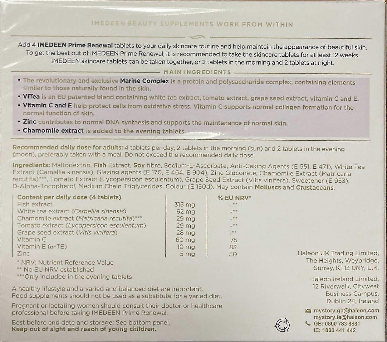 Aggiungi 4 IMEDEEN Prime Renewal alla tua routine quotidiana di cura della pelle e aiuta a mantenere un aspetto splendido. âï¸ Scientificamente provato per ridurre linee sottili e rughe âï¸ Supporta la produzione di collagene e il rinnovamento delle cellule della pelle âï¸ Aiuta a donare alla pelle un aspetto sano âï¸Â Aggiungi 4 (2 mattina, 2 sera) alla tua routine quotidiana di cura della pelle e aiuta a ridurre i segni visibili dell'invecchiamentoÂ