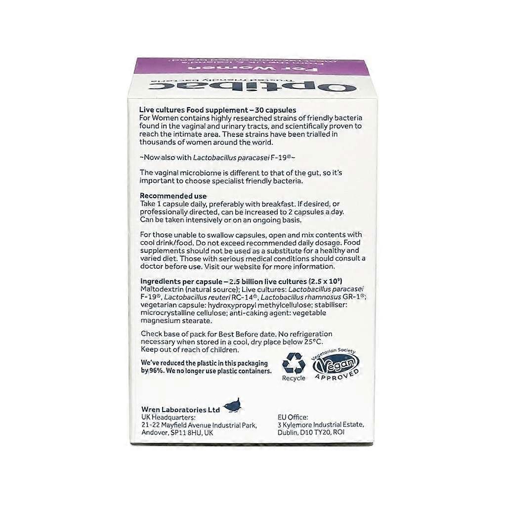 Per le donne contiene due ceppi altamente studiati di colture vive, Lactobacillus rhamnosus GR-1 e Lactobacillus reuteri RC-14, che sono stati clinicamente testati da oltre 2.500 donne in tutto il mondo. I due ceppi in questo prodotto hanno dimostrato di sopravvivere per raggiungere l'area intima. Con oltre 30 anni di ricerca, puoi fidarti del fatto che se vuoi un integratore di batteri amichevole soprattutto per la flora intima femminile, OptiBac 'Per le donne' è quello che fa per te. Questo integratore di colture vive è sicuro e appropriato per le donne in menopausa, così come per le madri incinte che allattano. Oltre a prendere questo prodotto, può anche valere la pena considerare fattori di stile di vita come la dieta (ad esempio riducendo l'assunzione di zucchero, che può nutrire batteri e lieviti nocivi), aumentando l'assunzione di acqua ed evitando salviette, docce e saponi nella zona intima, che possono sconvolgere il pH vaginale naturale. Modo d'uso: Assumere una o due capsule al giorno come desiderato, o come indicato professionalmente. Per l'uso continuo, una capsula al giorno può spesso essere sufficiente. Assumere con il cibo, preferibilmente a colazione. Per ottenere i migliori risultati, prendere ogni giorno. Le colture vive di OptiBac possono essere utilizzate su base continuativa.