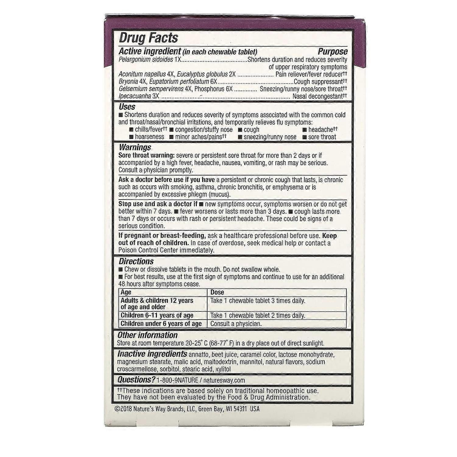 - Drug Facts Active Ingredient (in each chewable tablet) Purpose Pelargonium sidoides 1X Shortens duration and reduces severity of upper respiratory symptoms Aconitum napellus 4X