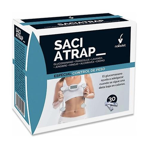Novadiet's Saciatrap is a food supplement that helps trap and eliminate ingested calories. It is enriched in glucomannan, phaseolamin, lavender, ginger, fennel, caraway, and chromium picolinate. It supposes a contribution of chromium for the organism, mineral that contributes to the normal metabolism of the macronutrients: fats, carbohydrates and proteins and contributes to maintaining normal blood glucose levels, controlling the sensation of appetite for sweets. Recommended for: Coadjuvant in the treatment of overweight and obesity. Intestinal transit regulator. Coadjuvant in the control of hypercholesterolemia and hyperglycemia. It is recommended to dissolve the content in a large glass of cold water (250 ml), stir vigorously and drink immediately. Next, drink another large glass of water (250 ml). Take before breakfast, lunch and dinner. Food supplements should not be used as a substitute for a balanced and varied diet and a healthy lifestyle. Do not exceed the recommended daily dose. Keep out of reach of young children.